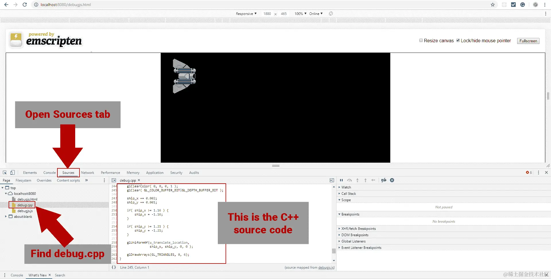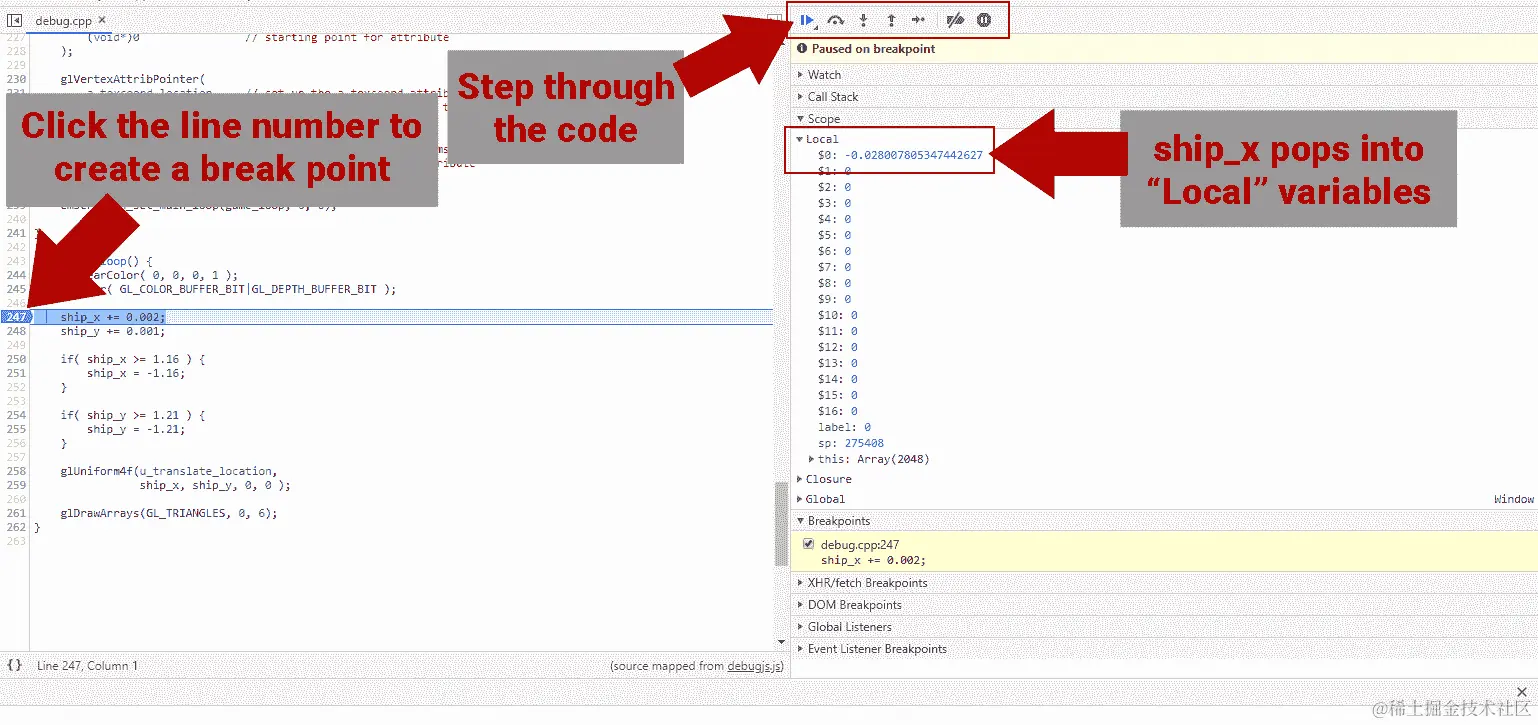 如果在“源”选项卡中看不到debug.cpp,可能需要点击顶部 URL 旁边的浏览器重新加载按钮来重新加载页面。正如我之前所说,界面感觉有点小问题,有时候 CPP 文件第一次加载不出来。希望在你阅读这篇文章时已经改变了。一旦选择了 CPP 文件,你应该能够在开发者工具窗口中间的代码窗口中看到我们的debug.cpp文件中的 C++代码。您可以通过单击代码行旁边的行号来在 C++代码中设置断点。然后,您可以使用“观察”变量上方的按钮逐步执行代码。尽管在撰写本文时观察变量不起作用,但您可能还是想尝试一下。WebAssembly 几乎每天都在改进,不断进行错误修复,所以在您阅读本文时,情况可能已经发生了变化。如果没有,您可以使用“本地”变量来了解一些值的变化。