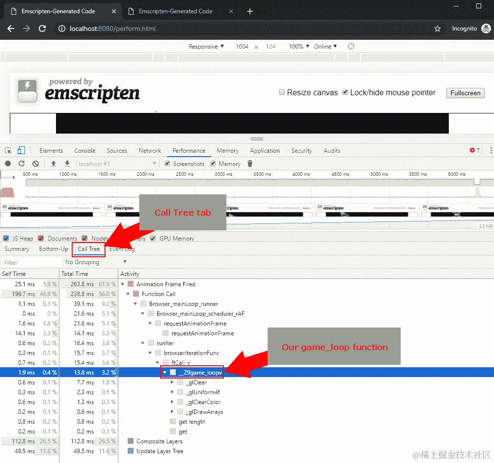 因为我们的game_loop函数在每一帧都被调用,所以我们可以在Animation Frame Fired树中找到这个调用。向下钻取,寻找game_loop。当我们找到这个函数时,它被搞乱了,因为它是一个 C++函数。所以,我们看到的不是_game_loop,而是_Z9game_loopv,尽管你可能看到的搞乱的形式不同。如果你想要防止这种搞乱,你可以将这个函数包装在一个extern "C"块中。
