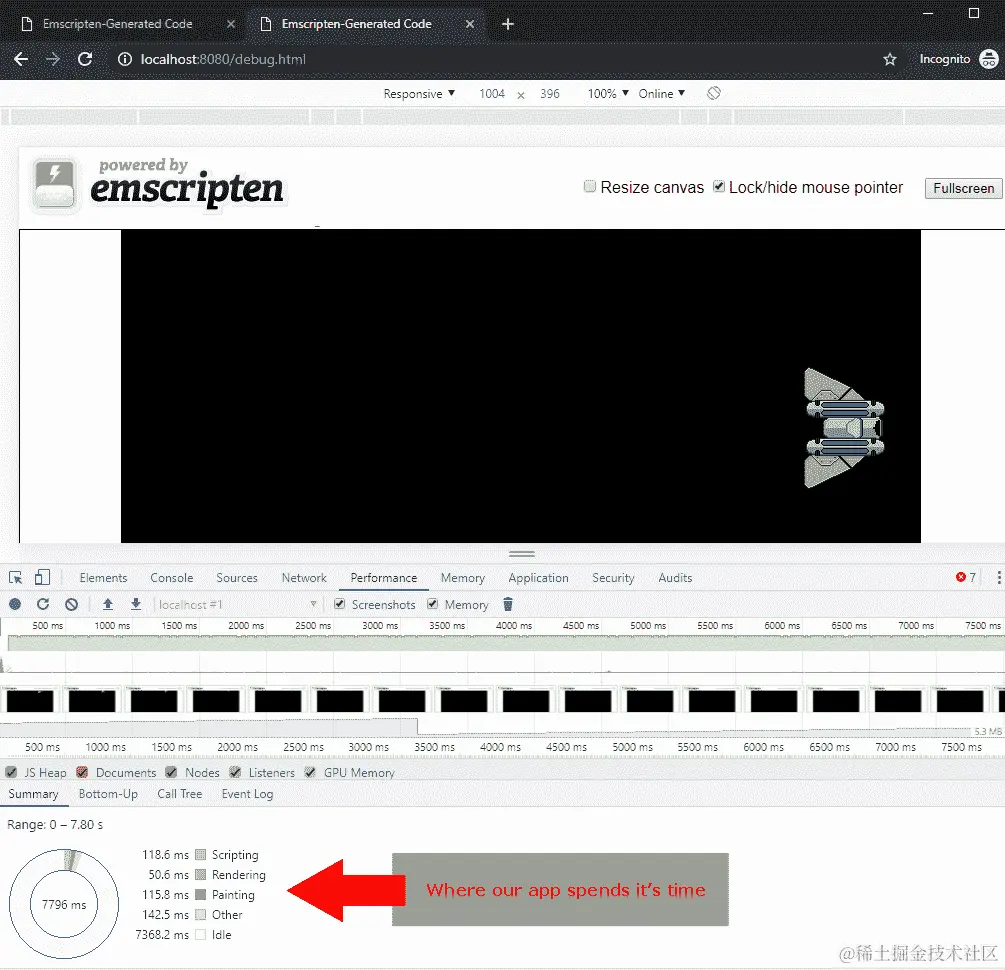 您可以看到这个函数的执行总共占据了浏览器 CPU 时间的 3.2%。您还可以查看这个函数中的每个 OpenGL 调用。如果您看一下我们的游戏循环,超过一半的 CPU 时间都花在了_glClear上。对于这个应用程序来说,这不是问题,因为绝大多数的浏览器 CPU 时间都是空闲的。然而,如果我们的游戏循环函数占用了大部分 CPU 时间,我们就需要看看在这个函数中我们花费了多少时间。