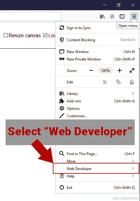 要打开 Firefox 开发者工具,点击浏览器窗口右上角的菜单按钮,然后选择 Web 开发者: