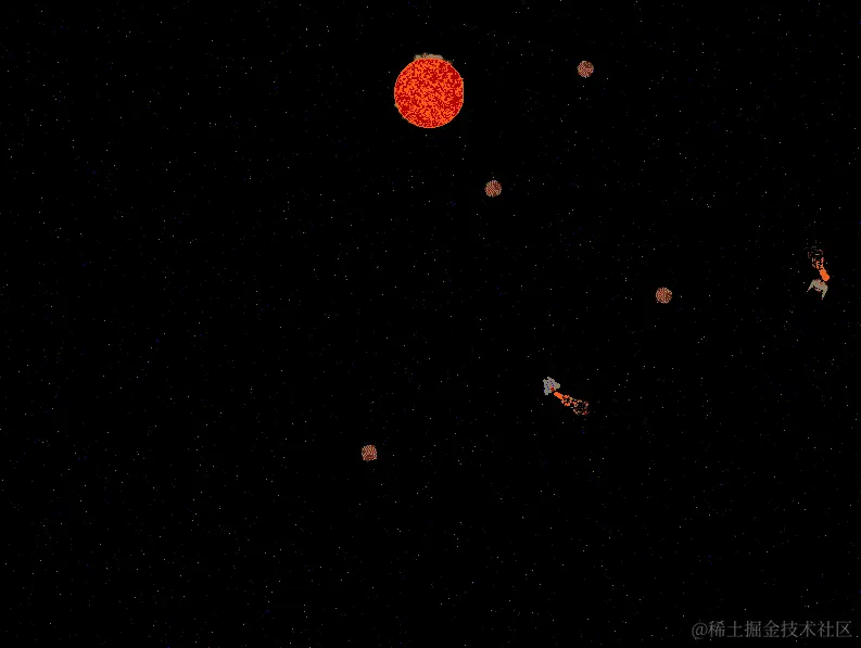 游戏画面是我们一直拥有的画面。这是玩家在其中移动他们的太空飞船,试图摧毁敌人飞船的画面。我们可能不需要改变这个画面的工作方式,但我们需要根据游戏状态添加到这个画面的过渡。游戏需要在玩家点击按钮时从开场画面过渡到我们的游戏画面。如果任何一艘飞船被摧毁,玩家还需要从这个画面过渡到游戏结束画面。如下所示: