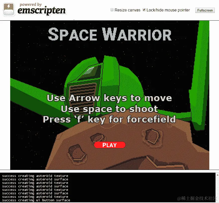 我们的游戏需要一个开场画面,原因有几个。首先,我们不希望用户加载网页后立即开始游戏。用户加载网页并不立即开始玩游戏有很多原因。如果他们的连接速度慢,他们可能在游戏加载时离开电脑,可能不会注意到游戏加载完成的那一刻。如果他们通过点击链接来到这个页面,他们可能还没有准备好在游戏加载完成后立即开始玩。在将玩家投入游戏之前,让玩家确认他们已经准备好是一个很好的做法。开场画面还应包括一些基本游戏玩法的说明。街机游戏在街机柜上放置简单的说明,告诉玩家他们必须做什么才能玩游戏。众所周知,游戏 Pong 在柜子上印有说明避免错过球以获得高分。不幸的是,我们没有街机柜来打印我们的说明,所以使用开场游戏画面是下一个最好的选择。我们还需要一个按钮,让用户在点击时开始玩游戏,如下所示: