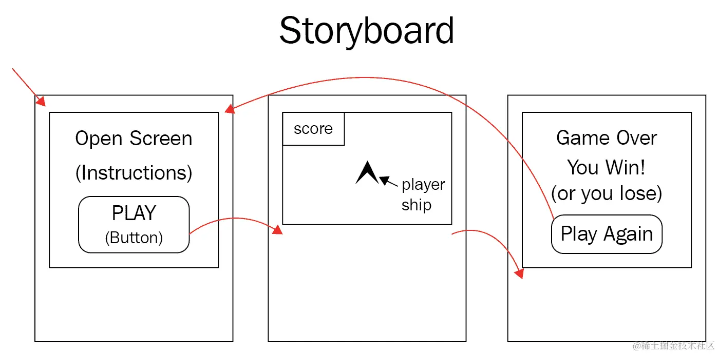 在实现 UI 时,我们需要做的第一件事是确定一些需求。我们的用户界面到底需要什么?其中的第一部分是决定我们游戏需要哪些游戏画面。这通常是游戏设计过程中早期就要做的事情,但因为我正在写一本关于 WebAssembly 的书,所以我把这一步留到了后面的章节。决定游戏需要哪些画面通常涉及故事板和一个过程,通过这个过程,您可以通过讨论(如果有多人在游戏上工作)或者思考用户将如何与您的网页以及网页上的游戏进行交互的方式来决定:
