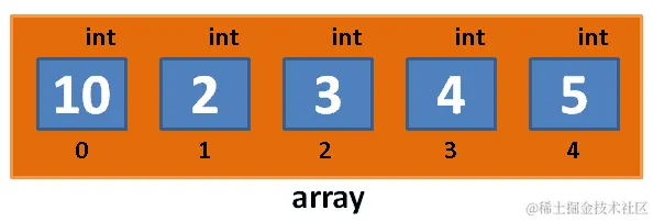 也就是说,在array变量内部有五个槽或元素。在每个槽内部是一个常规的int变量。你也可以通过传入值来声明数组,就像这样: