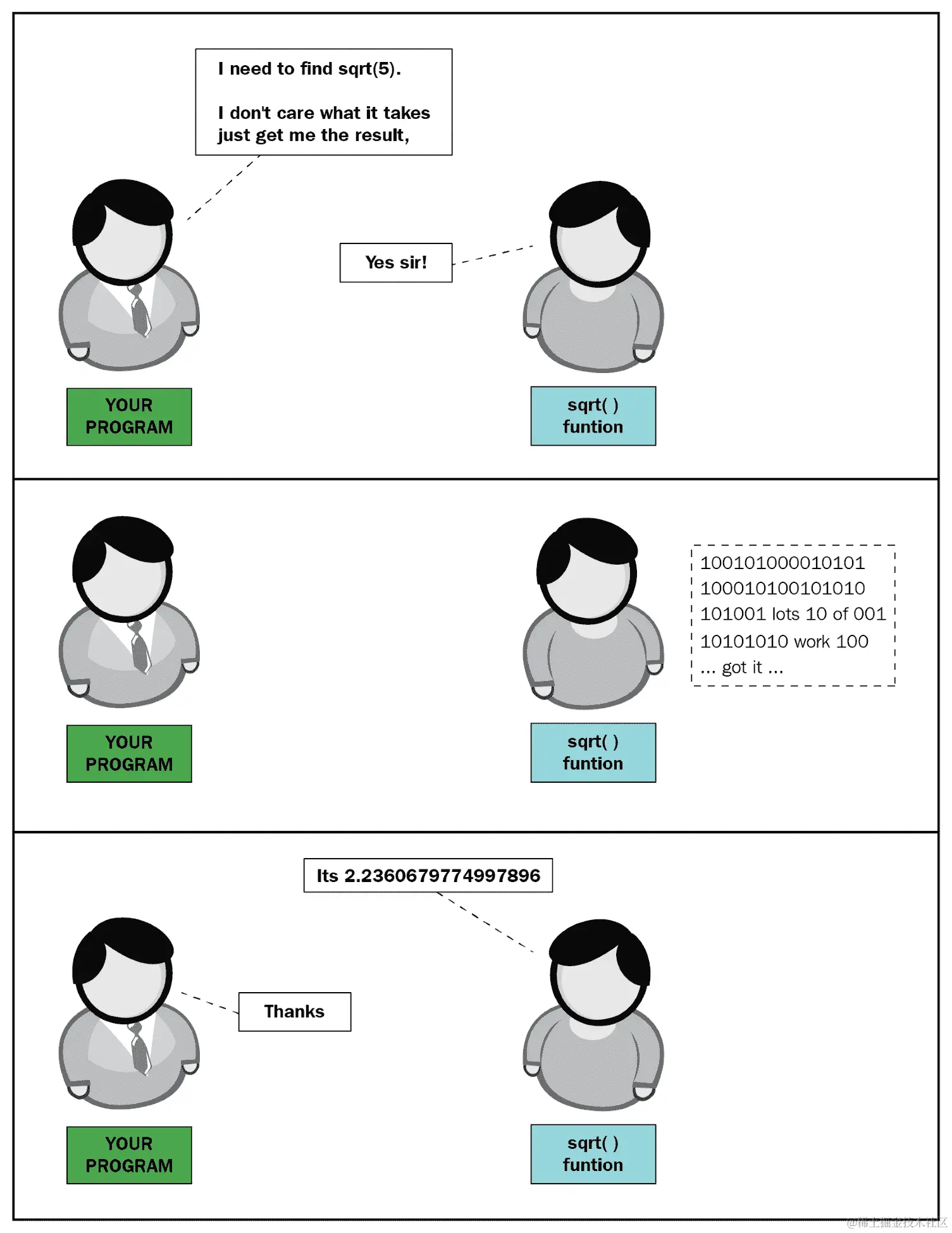 你知道如何找到一个像 5 这样的难题的平方根吗? 这并不简单。 一个聪明的灵魂坐下来写了一个可以找到各种类型数字的平方根的函数。 你必须理解如何找到 5 的平方根的数学原理才能使用sqrt(5)函数调用吗? 当然不! 就像服务员不必理解如何烹饪披萨就能得到披萨一样,C++库函数的调用者不必完全理解库函数的内部工作原理就能有效地使用它。