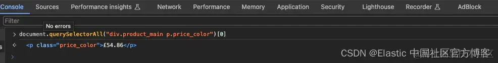 要尝试 CSS 选择器,我们可以使用 document.querySelectorAll。例如,要使用 CSS 选择器选择价格,我们可以在浏览器控制台中运行:document.querySelectorAll("div.product_main p.price_color")[0]。