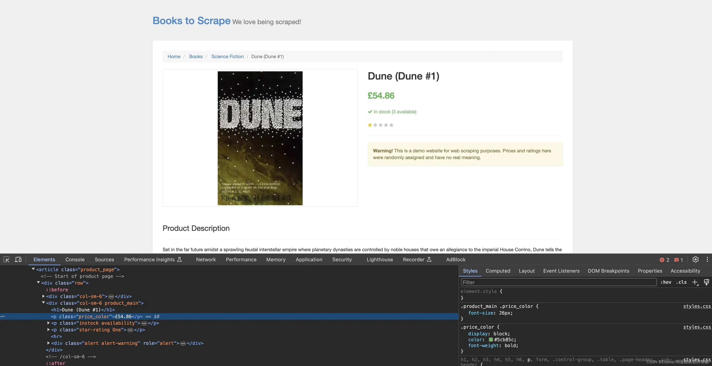 使用浏览器检查工具,我们可以看到哪个 HTML 标签包含价格文本,这里是一个带有 class=price_color 的 HTML 标签