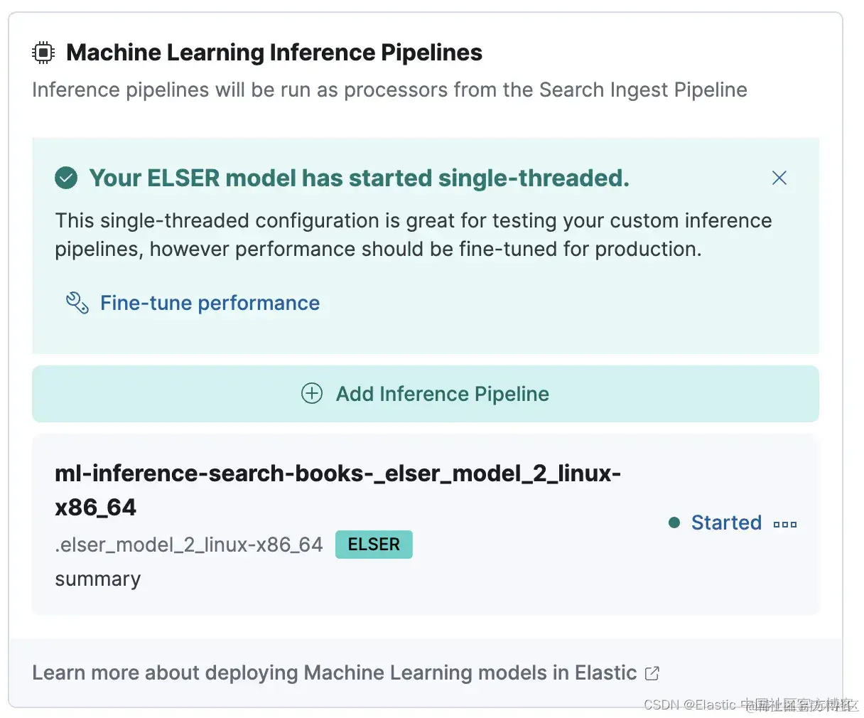 返回到 Pipelines 标签页,向下滚动到 Machine Learning Inference Pipelines 部分。如果还未部署和启动 ELSER 模型,此处可以进行部署和启动。