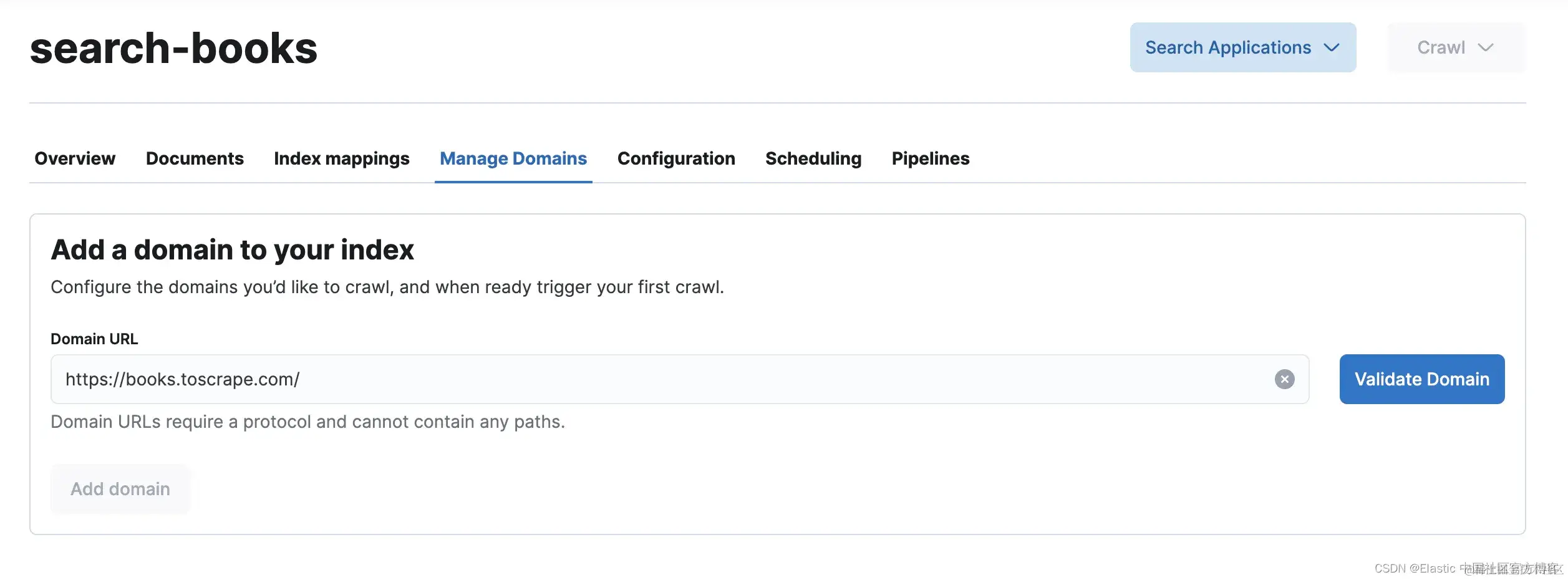 为索引提供一个名称,在我们的例子中是 search-books,并在下一个屏幕中输入主网站 URL:books.toscrape.com/。然后验证域名,并等待执行一些检查,以确保该域名可以被爬取。