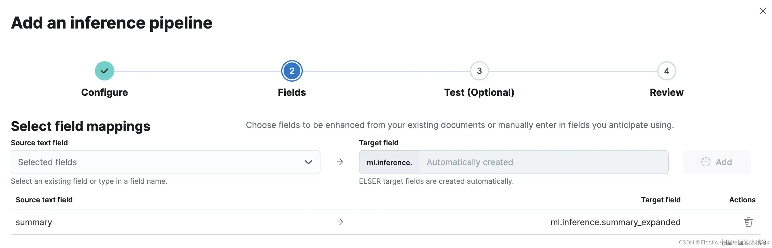 然后,通过单击 “Add Inference Pipeline” 按钮添加一个新的推理管道。在第一个屏幕上选择 ELSER 模型,然后转到下一个屏幕,在那里选择推理管道的输入和输出字段。在我们的案例中,我们想要在图书 summary 上启用语义搜索。我们选择该字段并将其添加到列表中。