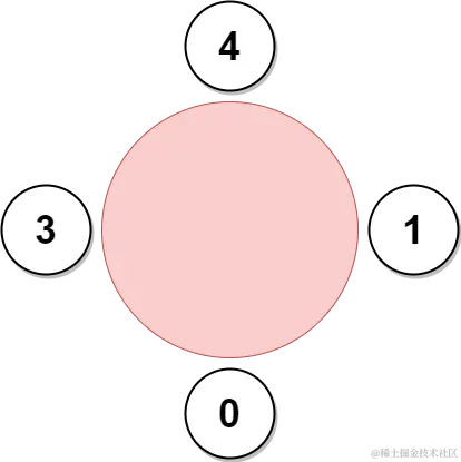 上图展示了公司可以邀请员工 0,1,3 和 4 参加会议以及他们在圆桌上的座位。