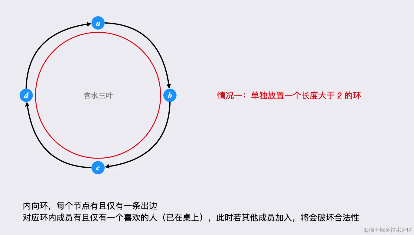 根据题意,圆桌最多放置一个长度大于 的环(内向环,只有一条出边,即只有一个喜欢的人,安插其他非环成员,会破坏留下参加会议的必要条件),但可放置多个长度为 的环,且多个环可延伸出最长链(利用左右两侧只需有一个喜欢的人即满足)。