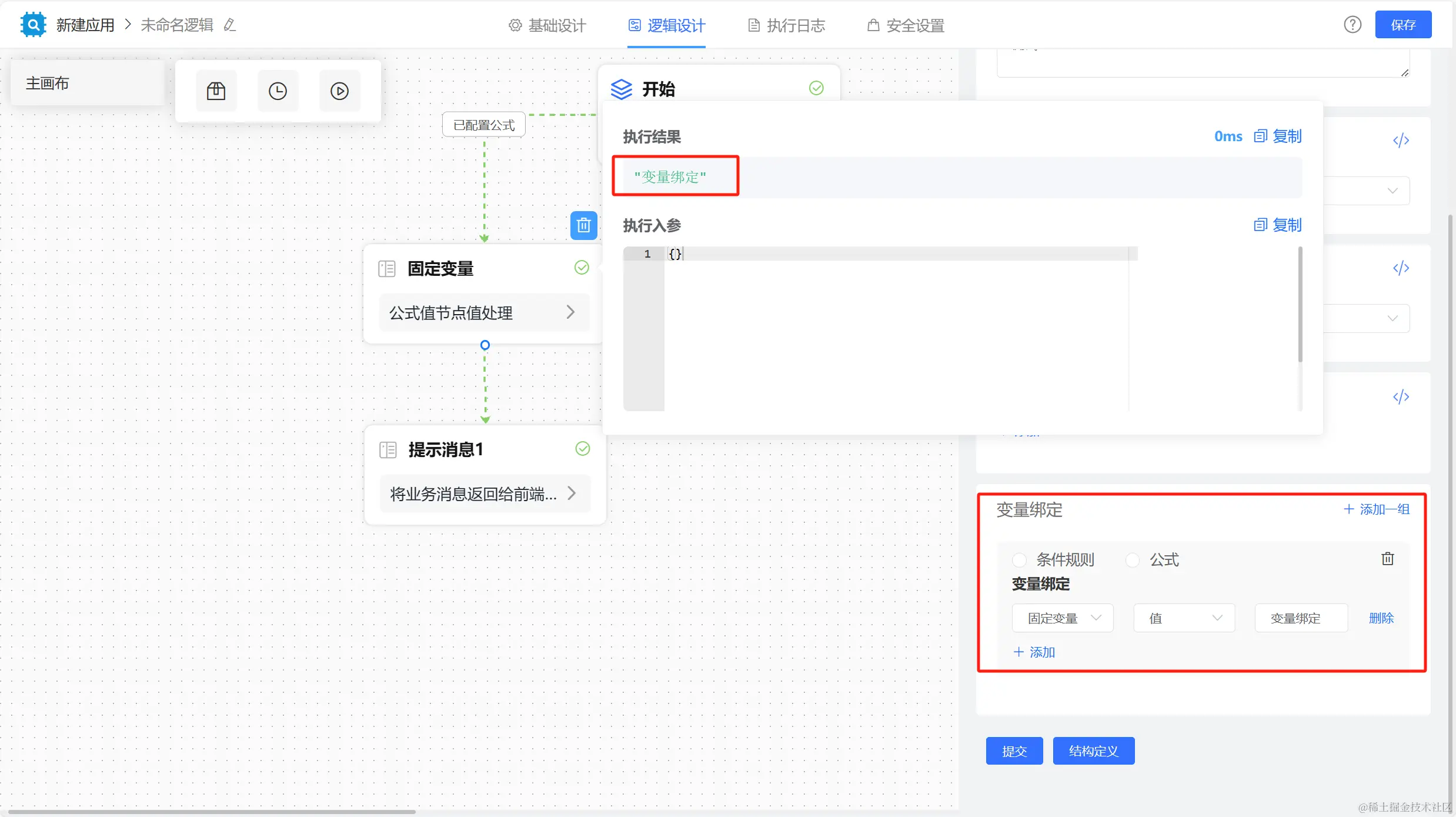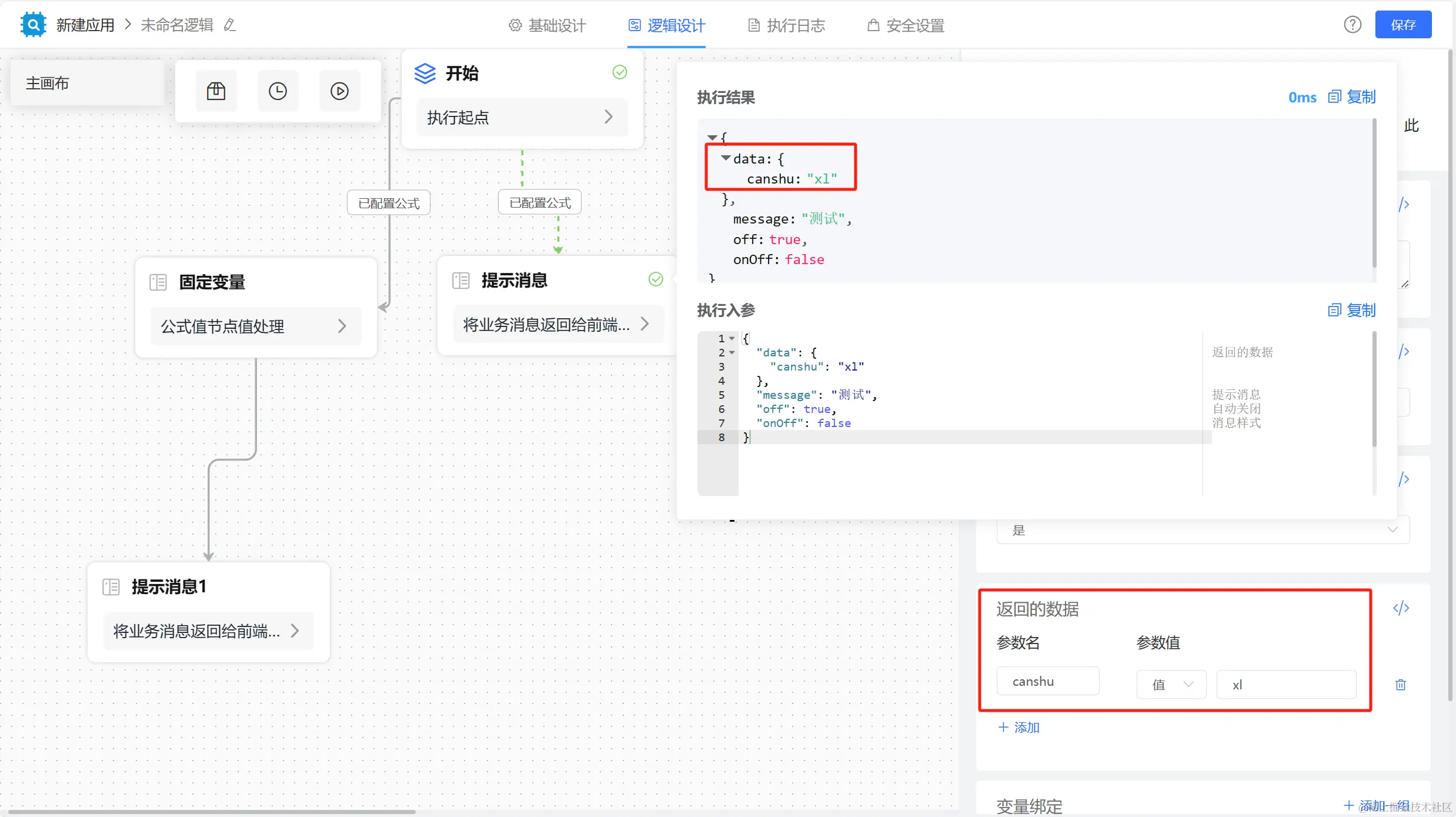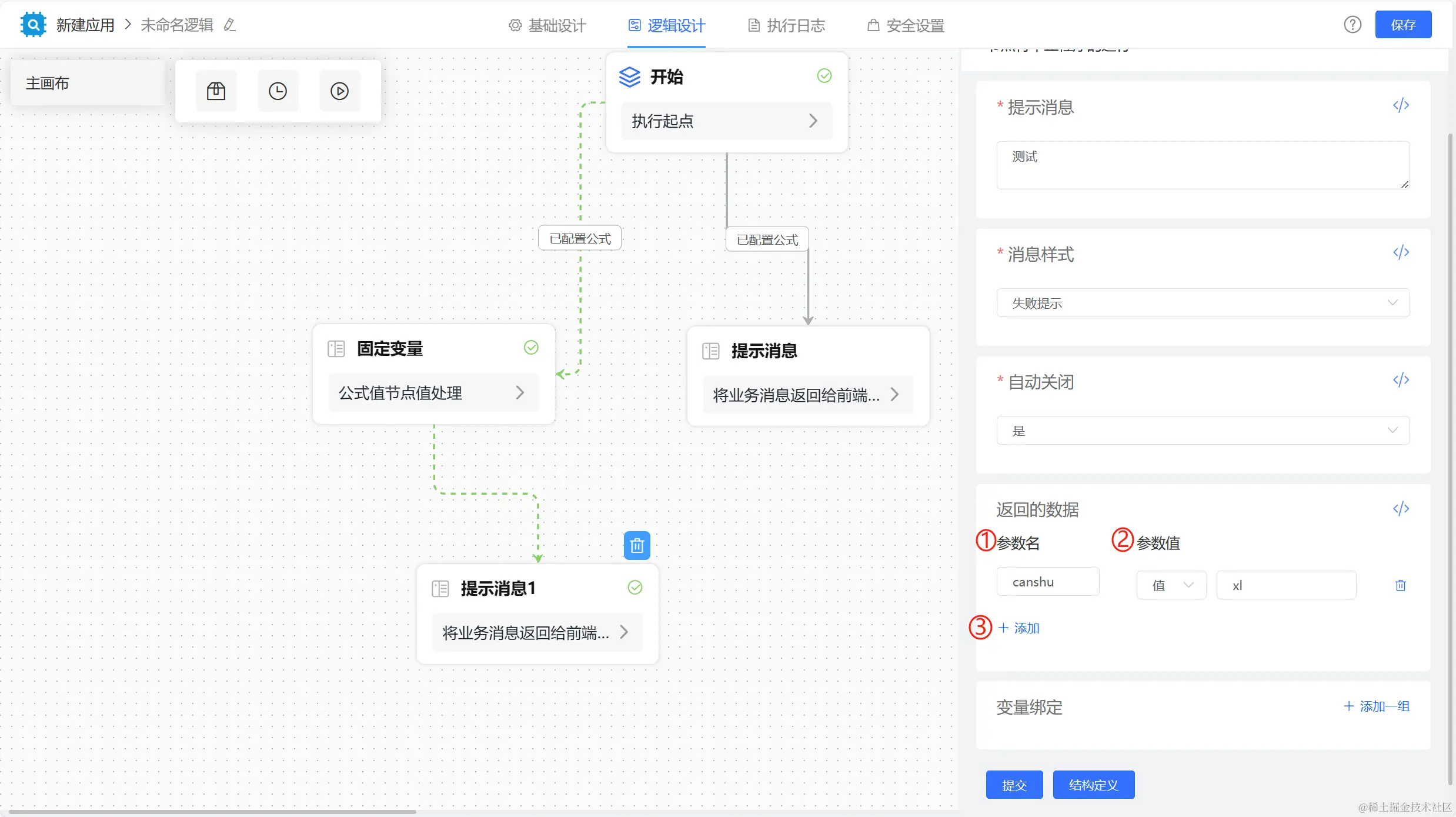设置参数,选择具体的参数值、字段、公式或为空,提示消息内容返回至前端同时节点执行结果返回设置的参数