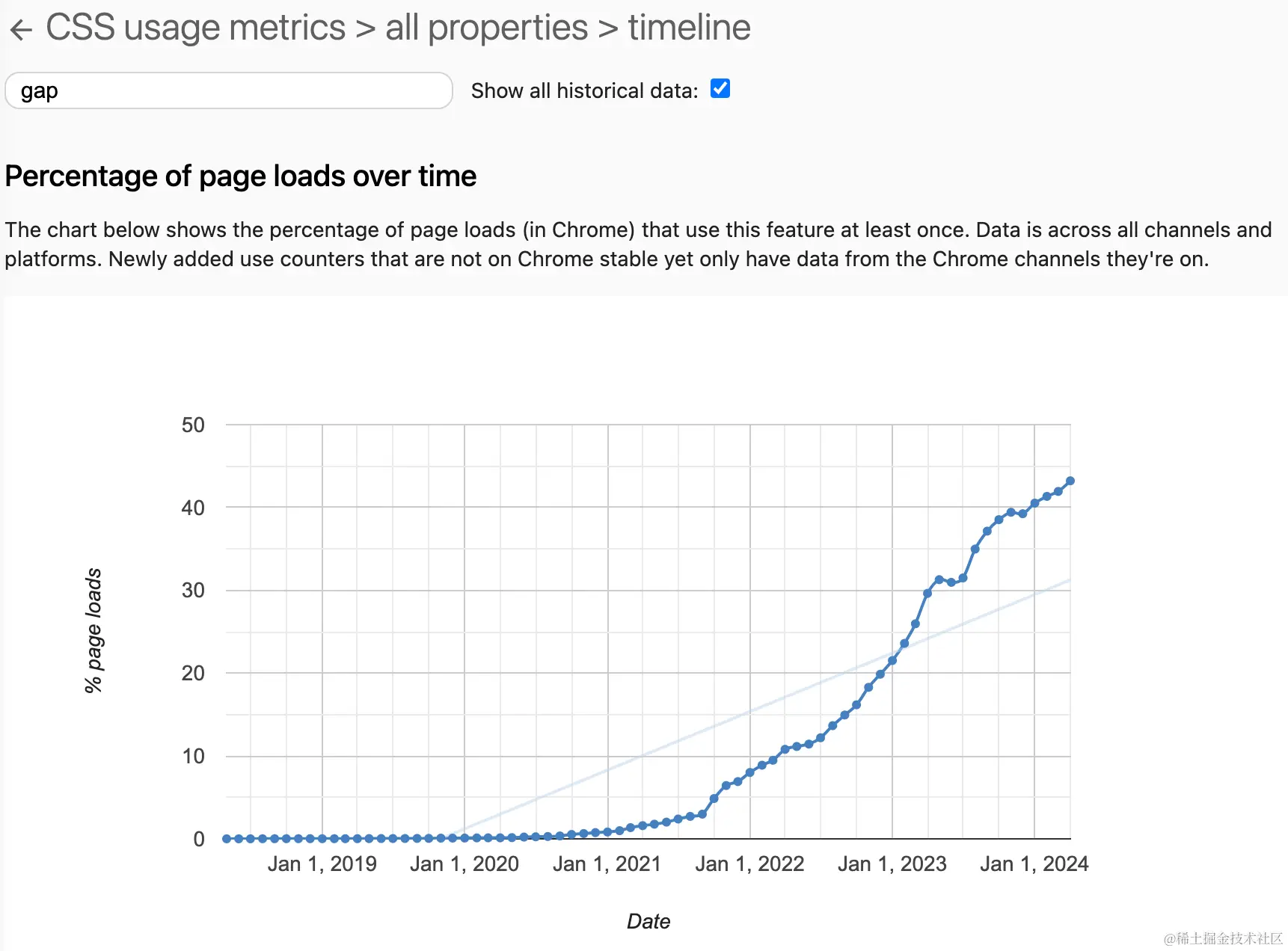 作者根据谷歌统计数据:margin在谷歌浏览器页面使用的比例,得出CSS margin 属性使用率在下降,可以使用 gap(用于设置行与列之间的间隙) 来替代。