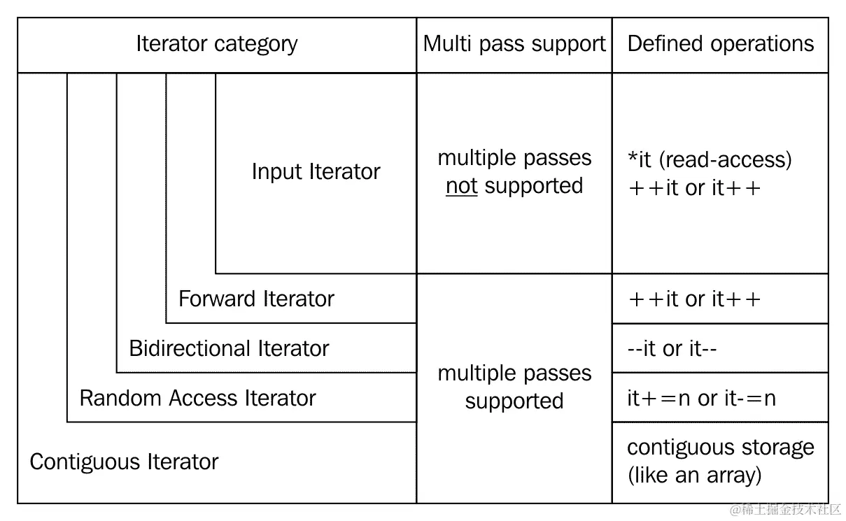 迭代器有多个类别,它们有不同的限制。它们并不难记忆,只需记住一个类别所需的功能是从下一个更强大的类别继承的。迭代器类别的整个重点在于,如果算法知道它正在处理哪种类型的迭代器,它可以以一种优化的方式实现。这样,程序员可以放松并表达自己的意图,而编译器可以选择给定任务的 最佳实现。