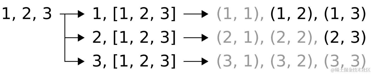 1, 2, 3的笛卡尔积并打印这些配对。去除冗余配对后,这应该得到数字配对(1, 2),(2, 3)和(1, 3)。如果我们忽略顺序并且不希望在一个配对中有相同的数字,那么就不可能有更多的组合。这意味着我们不希望(1, 1),并且认为(1, 2)和(2, 1)是相同的配对。