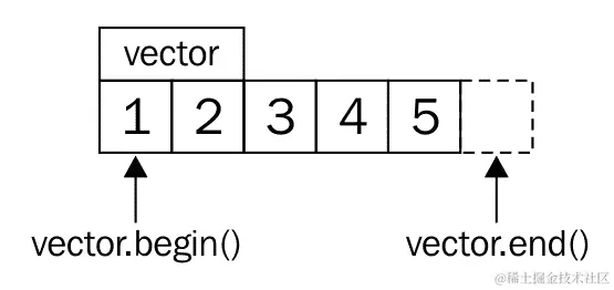 std::begin(vector) 命令与 vector.begin() 相同,返回一个指向第一个项目(1)的迭代器。std::end(vector) 与 vector.end() 相同,返回一个指向最后一个项目之后一个项目的迭代器(5之后)。