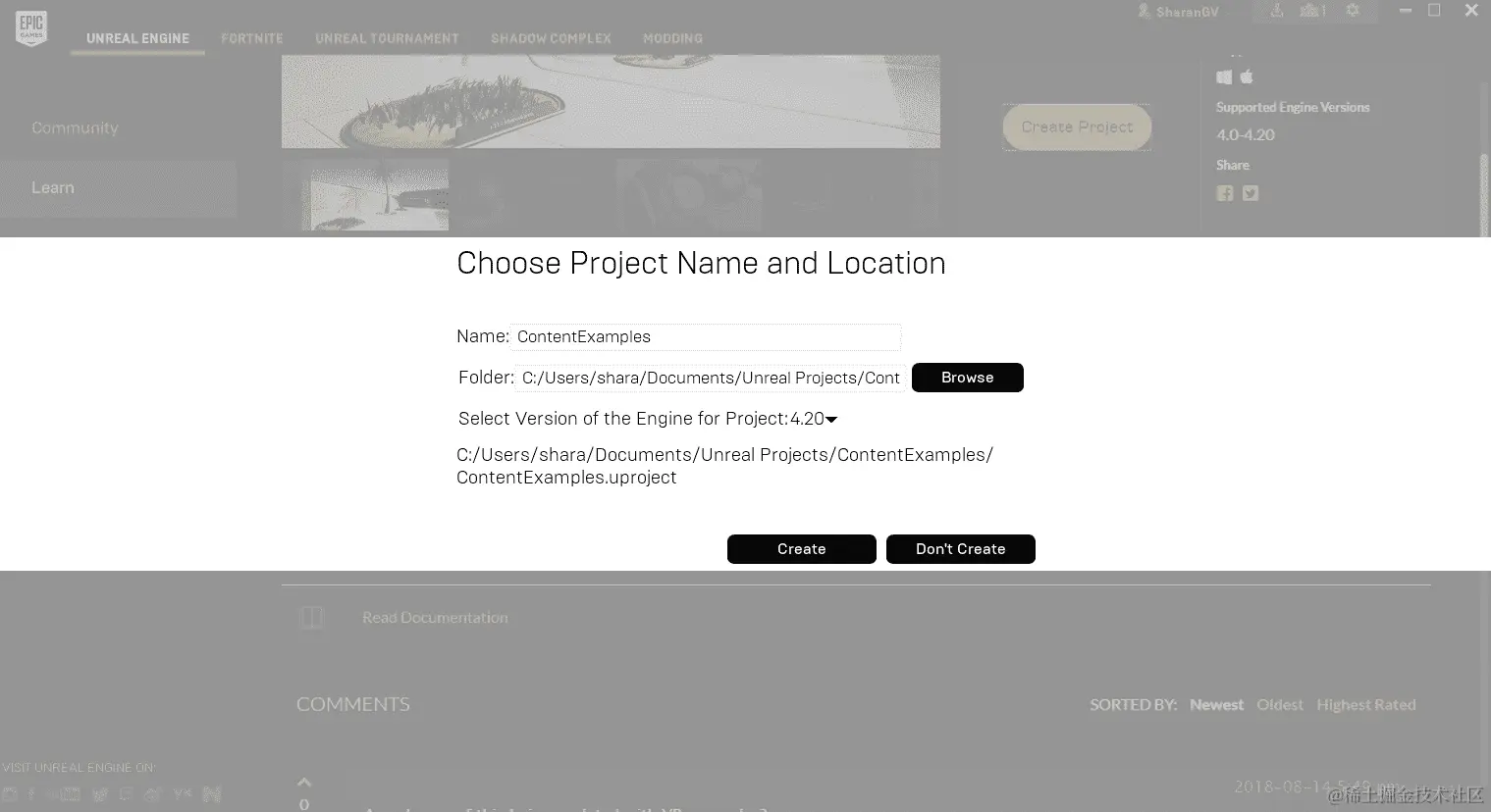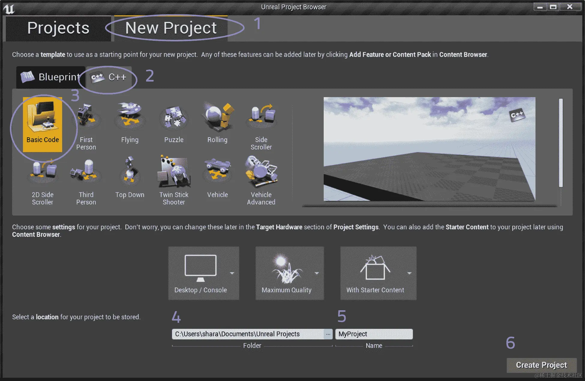 设置项目所在的目录(我的是 Y:Unreal Projects)。选择一个有很多空间的硬盘位置(最终项目大小约为 1.5GB)。