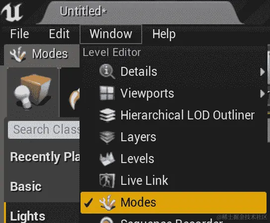 - 转到窗口,然后点击模式,确保灯光面板显示出来:
