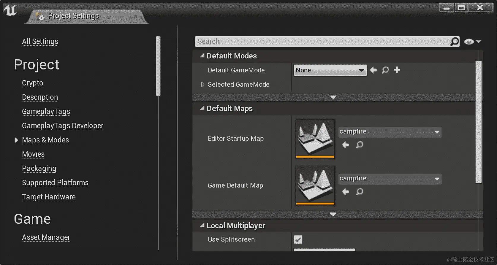 - 如果你想要更改编辑器启动时打开的默认级别,转到编辑 | 项目设置 | 地图和模式;然后,你会看到一个游戏默认地图和编辑器启动地图设置,如下面的截图所示: