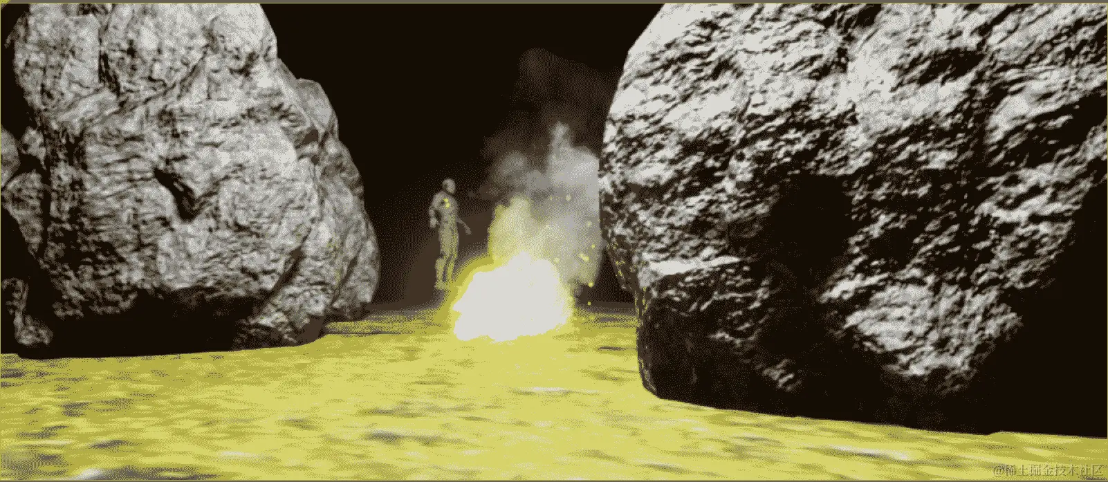 这次,我为地面添加了一个调整大小的形状/shape_plane(不要使用模式下的常规平面,一旦添加了玩家,你会穿过它),并用 T_ground_Moss_D 进行了纹理处理,还有一些道具/SM_Rocks 和粒子/P_Fire。