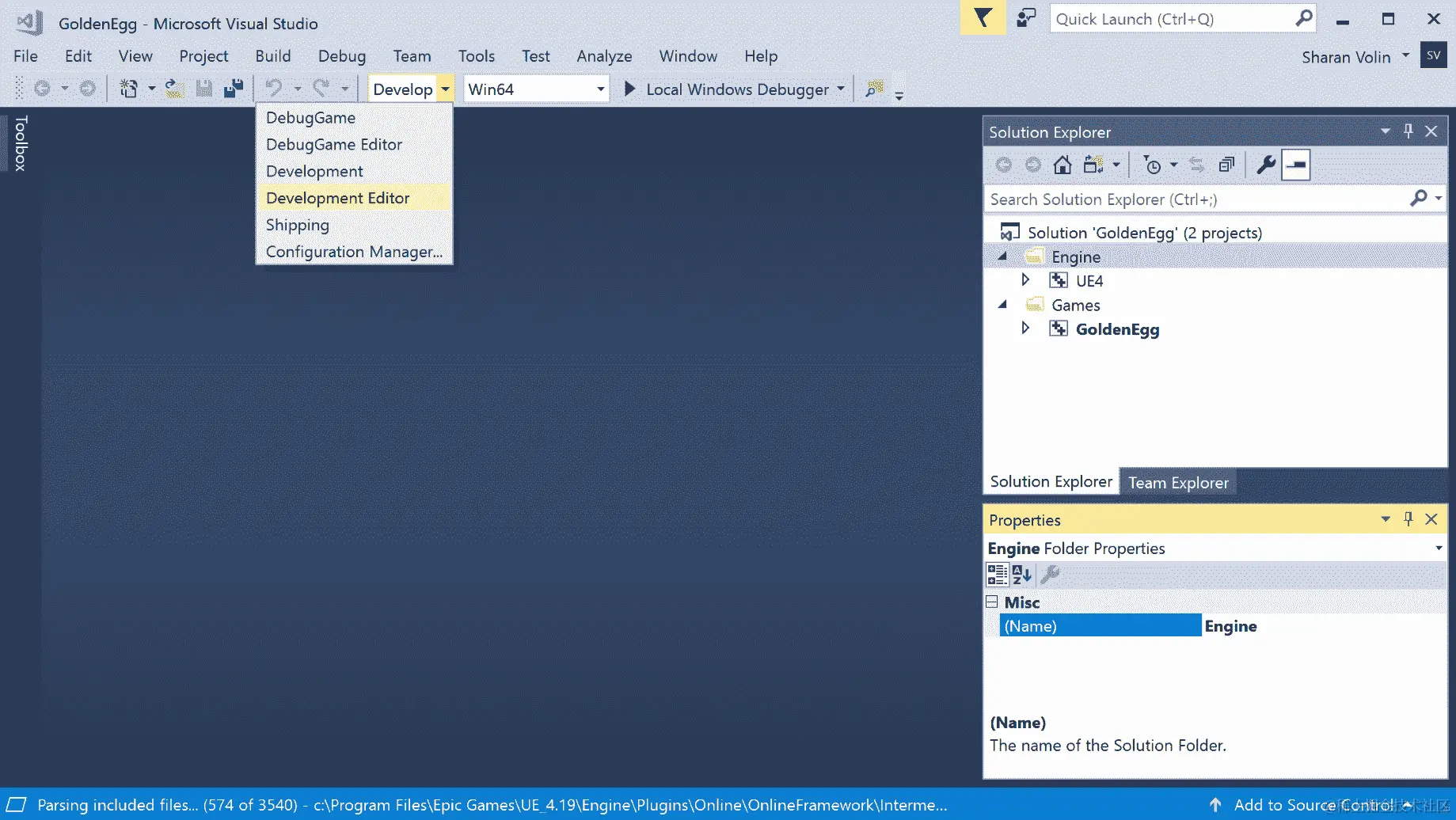 完成此操作后,UE4 启动器将启动 Visual Studio(或 Xcode)。这可能需要一段时间,进度条可能会出现在其他窗口后面。只有几个源文件可用,但我们现在不会去碰它们。