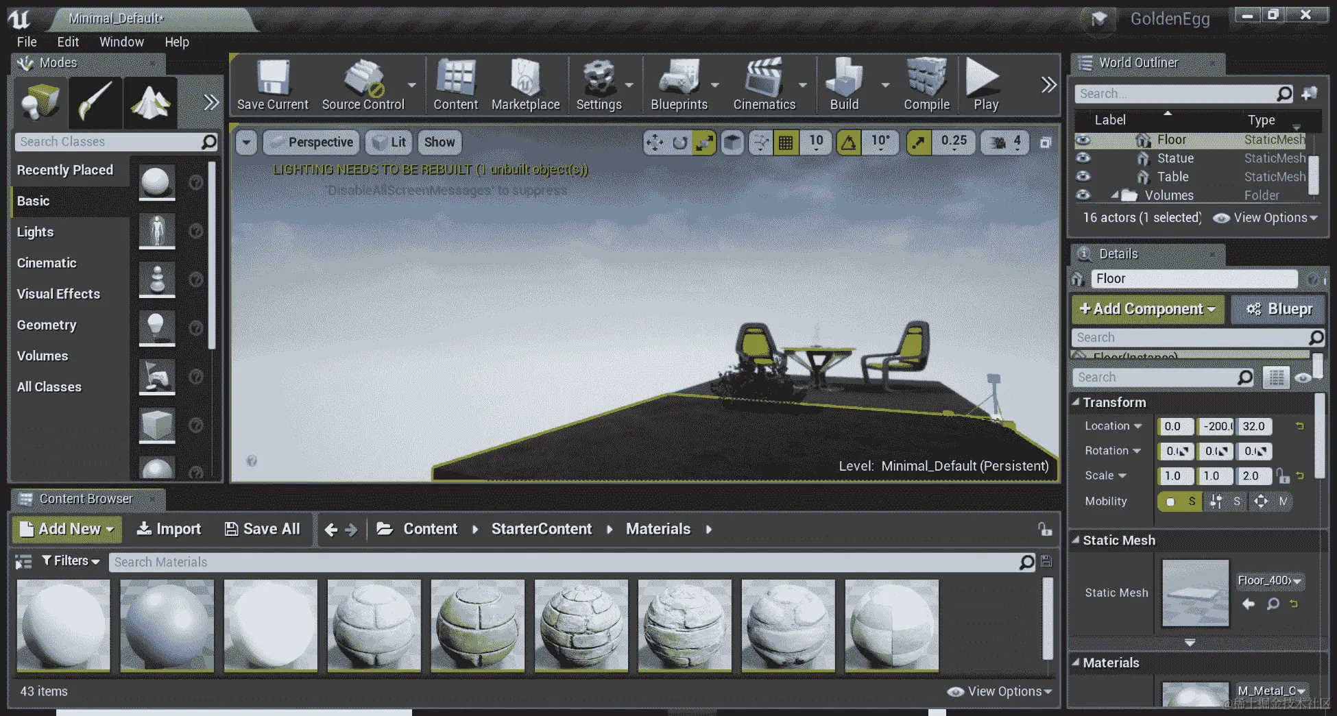 - 新的级别一开始会完全黑暗。尝试再次从内容浏览器选项卡中拖放一些对象。