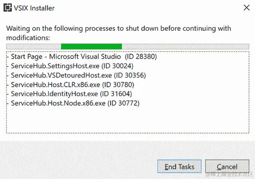 - 点击“修改”。它将安装并关闭 Visual Studio。如果您看到此对话框,您可能需要点击“结束任务”: