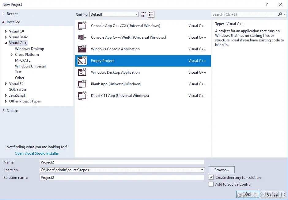 您需要从文件|新建|项目...重新开始之前的步骤。这次,在已安装的项目下,Visual C++将显示出来: