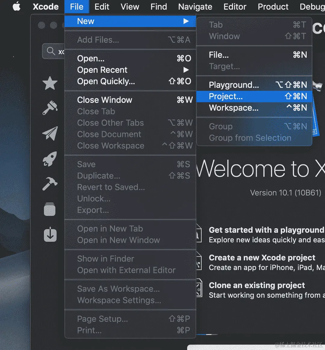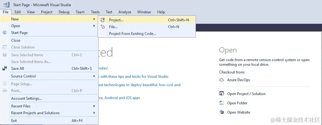 - 从“文件”菜单中,选择“新建 | 项目...”,如下截图所示: