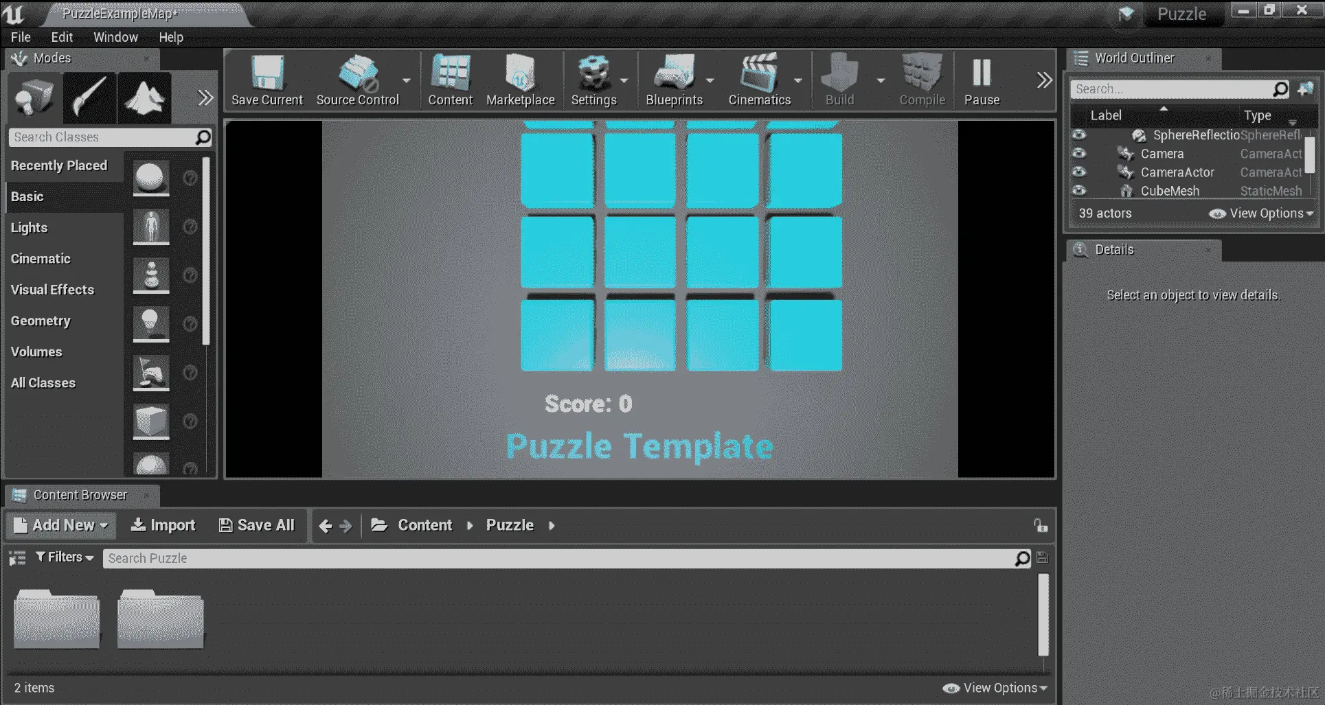 由于NumBlocks(用于确定何时停止循环)计算为Size*Size,我们可以通过改变Size变量的值来轻松改变生成的方块数量。转到PuzzleBlockGrid.cpp的第 24 行,将Size变量的值更改为4或5。然后,再次运行代码(确保您在 Unreal Editor 中按下编译按钮以使用更新后的代码)。