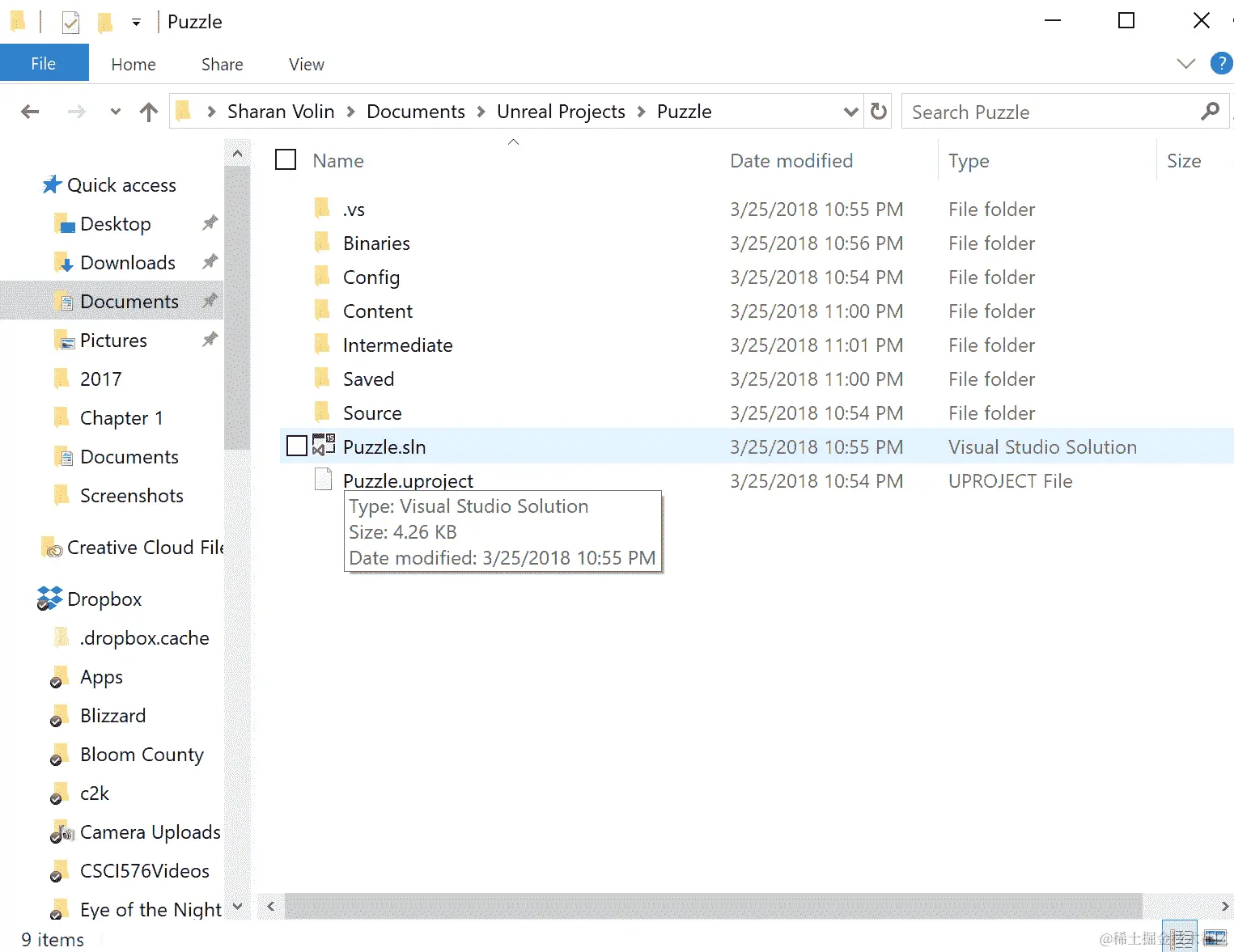 有几种方法可以打开您的虚幻项目。在 Windows 上,最简单的方法可能是导航到Unreal Projects文件夹(默认情况下位于用户的Documents文件夹中),然后在 Windows 资源管理器中双击.sln文件,如下截图所示: