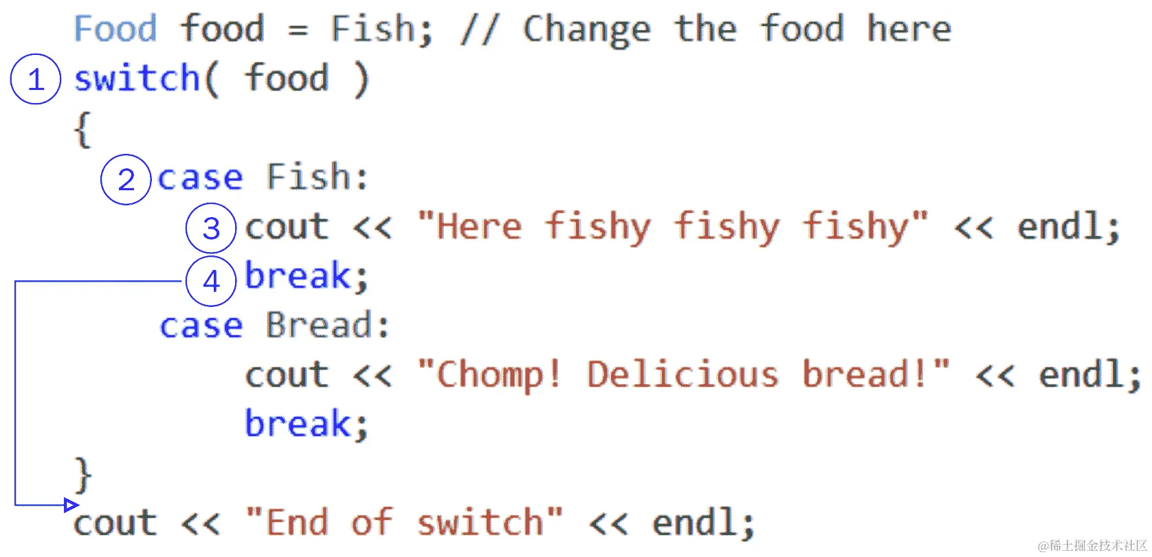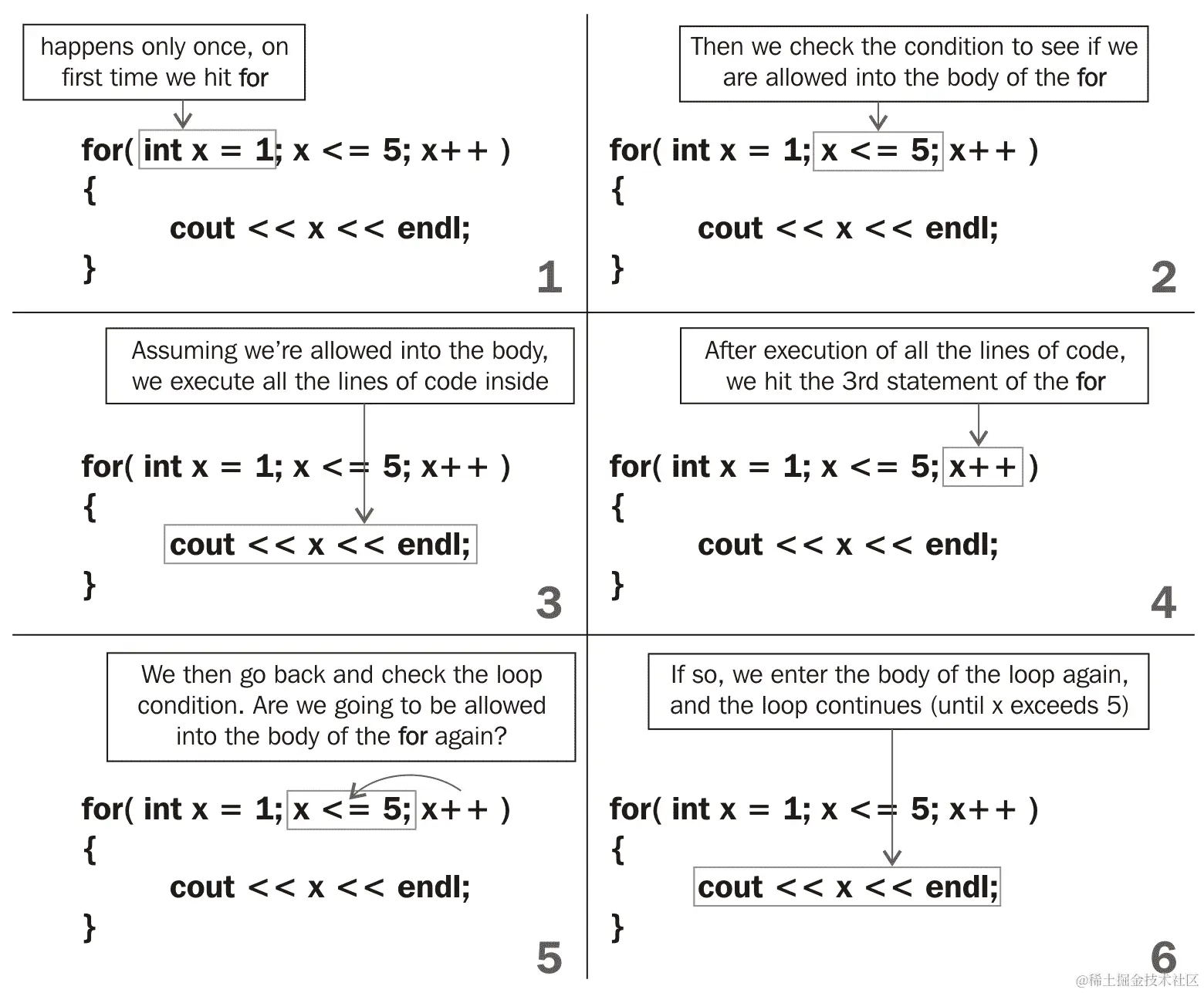 for循环的第一个语句(int x = 1;)只在我们第一次进入for循环体时执行一次。它通常用于初始化循环的计数变量的值(在本例中是变量x)。for循环括号内的第二个语句(x <= 5;)是循环的重复条件。只要x <= 5,我们必须继续留在for循环的体内。for循环括号内的最后一个语句(x++;)在每次完成for循环体后执行。