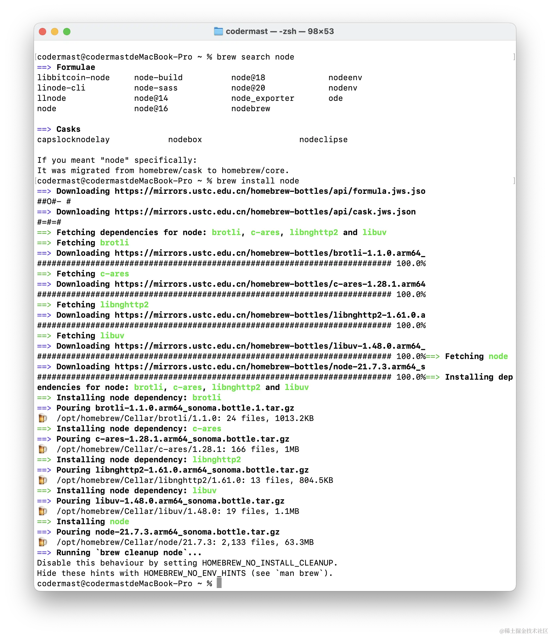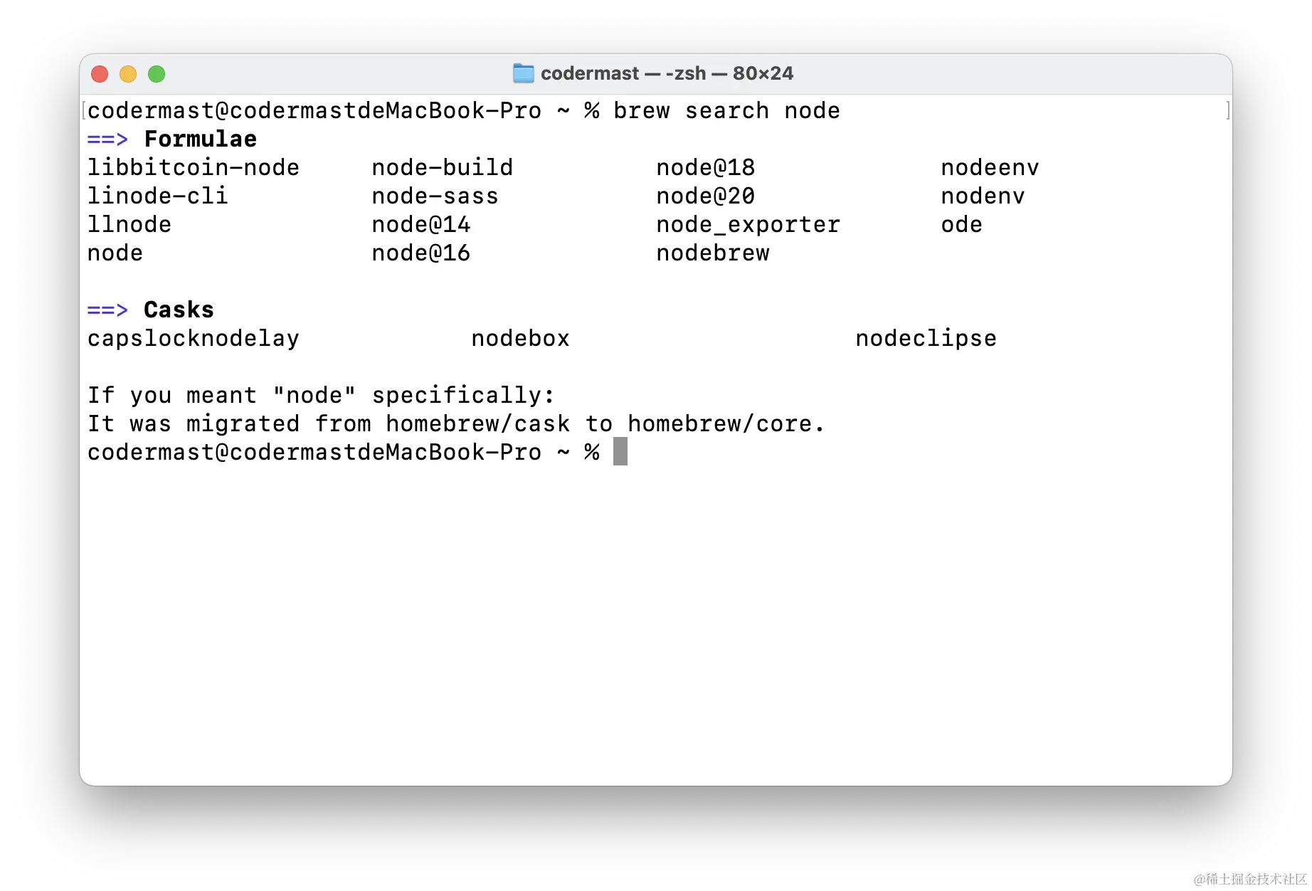 举个例子,如果你想要安装 Node.js,并且你知道他在 brew 中的软件包名,那么你可以直接使用该指令安装,如果你不知道的话,可以先试用 brew search 指令进行查找,然后再进行安装。