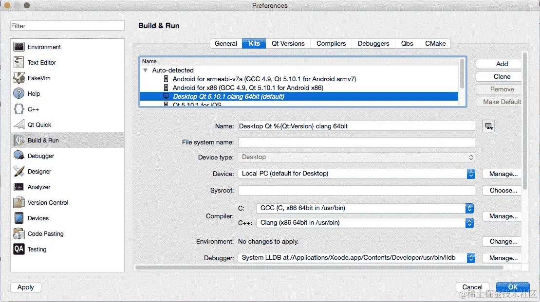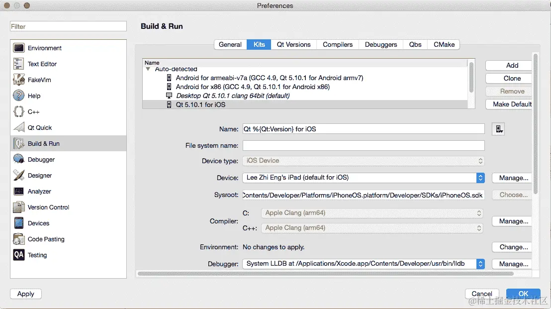 至于 macOS 和 iOS,使用的调试器是LLDB(LLVM 调试器),它默认随 Xcode 一起提供。Qt Creator 也会自动识别其存在并将其与您的项目链接起来。