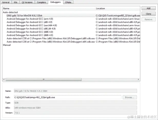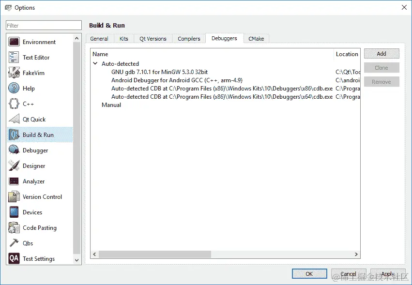 如果您需要向项目添加其他调试器,可以转到“工具”|“选项”|“构建和运行”|“工具包”,然后单击“克隆”以复制现有工具包。然后,在“调试器”选项卡下,单击“添加”按钮以添加新的调试器选择: