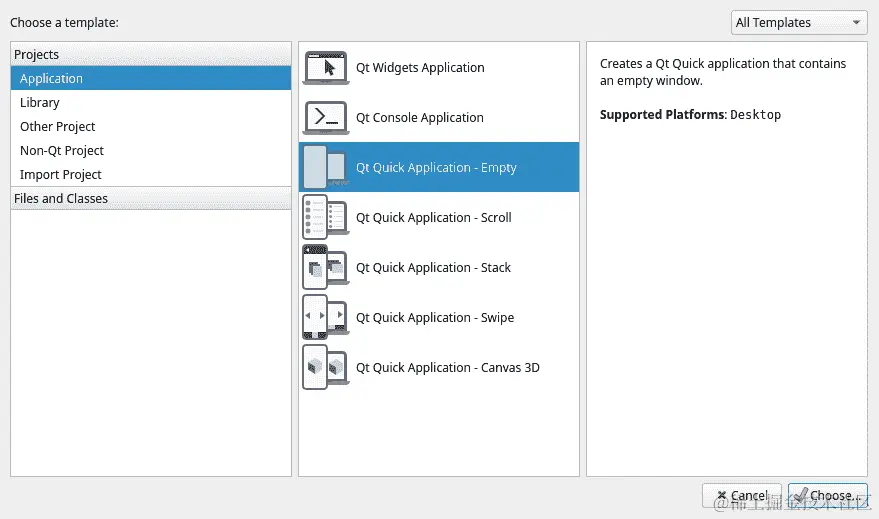 开发人员可以通过在创建项目时选择正确的选项来选择他们喜欢的开发应用程序的方法。开发人员可以选择 Qt Quick 应用程序而不是通常的 Qt Widgets 应用程序选项,这将告诉 Qt Creator 为您的项目创建不同的起始文件和设置,从而增强 Qt Quick 模块: