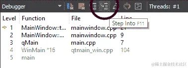 在上图中,您可以看到值仍然为 100,因为此时减法操作尚未运行。接下来,我们需要做的是单击位于 Qt Creator 底部的堆栈窗口顶部的“步入”按钮:
