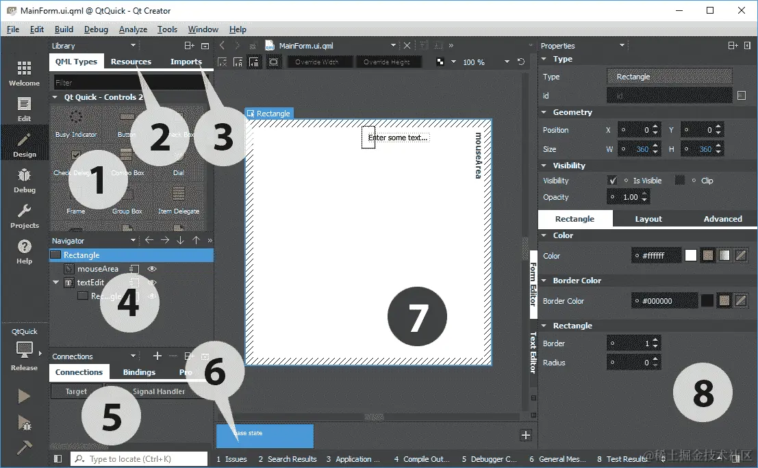 在上面的代码中,有一个Window类型,只能通过导入QtQuick.Window模块才能使用。设置了Window类型的属性后,声明了MainForm类型。这个MainForm类型实际上就是我们之前在MainForm.ui.qml中看到的整个用户界面。由于MouseArea和TextEdit类型已在MainForm.ui.qml中公开,我们现在可以在main.qml中访问并使用它们。