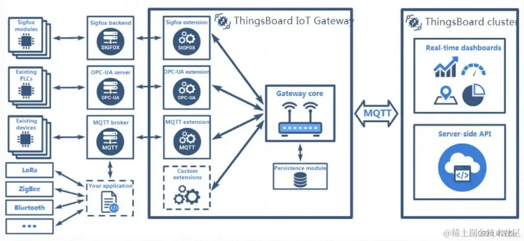 在所有的物联网中,IOT 网关是非常重要的一环,大部分(60%-80%)设备都属于哑终端设备(不支持 IP),这些设备都需要通过网关才能够接入到云平台。因此 Thingsboard 支持通过 IOT 网关进入到平台,下面是 IOT 网关的整体架构图。