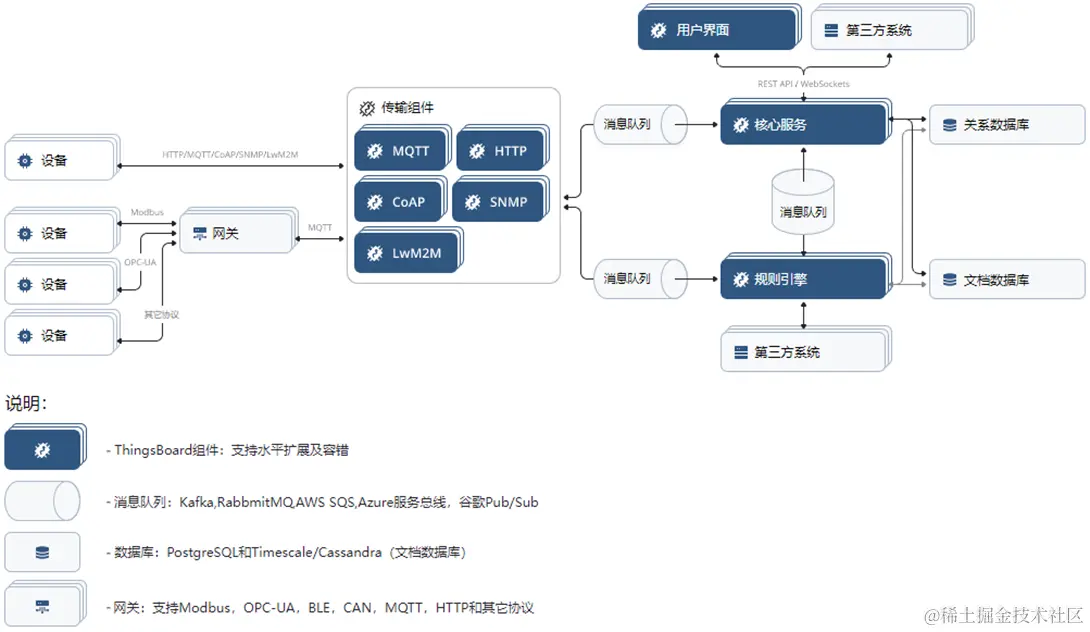 Thingsboard有两种架构形式,微服务架构和 Monolithic 架构,两个架构的基本功能一致,该文档主要介绍 Monolithic 架构,架构图如下: