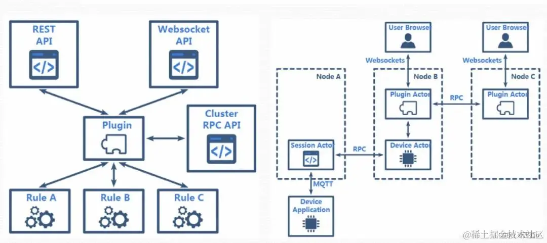 - 规则引擎使用Actor来实现。主要实体的actor:规则链和规则节点。