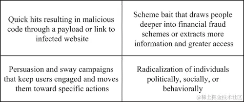 说服和影响力攻击更加复杂,社会工程更加精密。对于阴谋内幕的承诺,或者有关名人或政治家的恶意文字或照片,让用户保持参与并推动他们朝着更具体的行动。这包括继续关注帖子或电子邮件以了解更多信息或看到更多内容,尤其是涉及情感话题如伊斯兰恐惧症、仇外症、种族主义、性别歧视或对自由主义者的仇恨时。这些攻击旨在尽可能长时间地让人们参与,并在可能的情况下将他们招募到一个类似思想的象征性团体或部落中。这种类型的攻击更难解释,因为人们是在回应他们的信仰,并被他们想要听到或看到的东西所吸引,而不是更加平衡的观点。