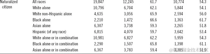 表 8.2 2016 年本土化和归化公民按种族、西班牙裔起源和出生地区划的投票和登记