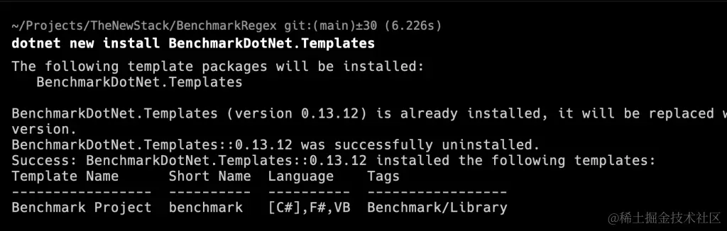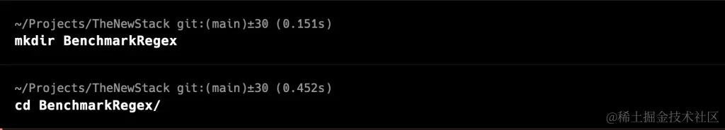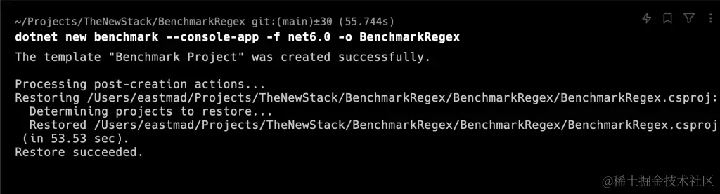 这只是使用可用的 benchmark template 为我们设置一个名为 BenchmarkRegex 的项目,以设置合适的项目框架。我们可以看到生成的位于目录中的文件: