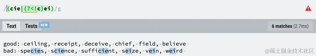 上面的模式通过查找不带 “c” 的 “cie” 或 “ei” 来查找破坏性示例。请注意,环视是正则表达式中可能在不同实现中表现不同的函数之一,应谨慎使用。在这种情况下,我们使用否定后顾 (?<!c) 来确认 “ei” 前面没有 “c”,但不会消耗该 “c”。阅读文章了解更多详情。