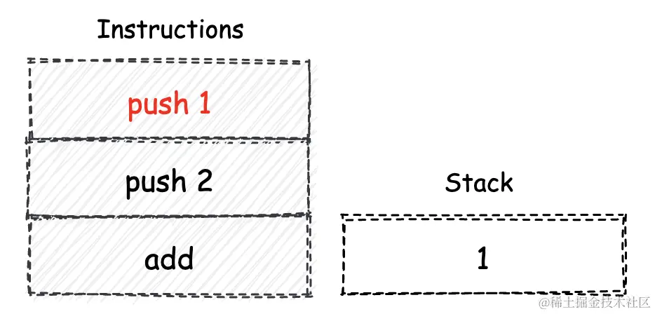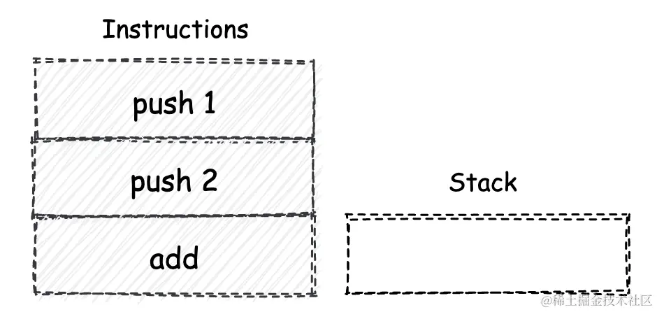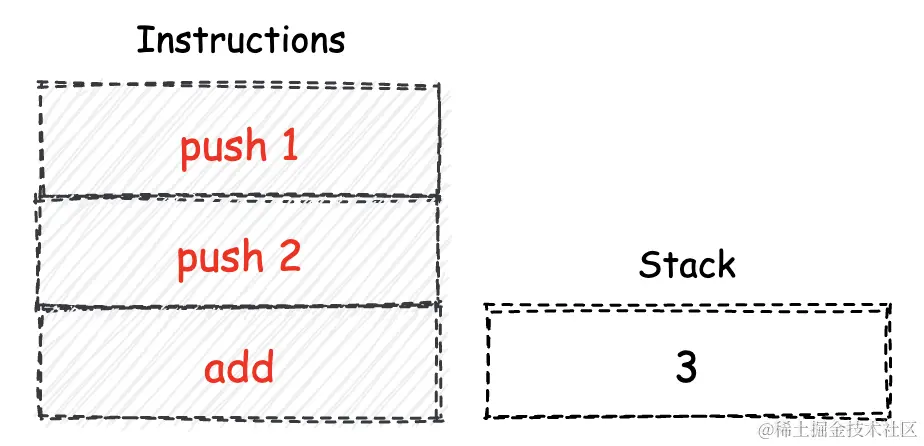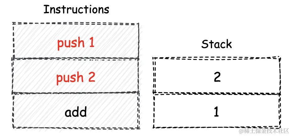 在引言中,我提到了“堆栈式虚拟机”,虚拟机大家都能理解,那么这里的“堆栈式”的含义是什么呢?这里是指wasm指令集的依赖的计算模型。