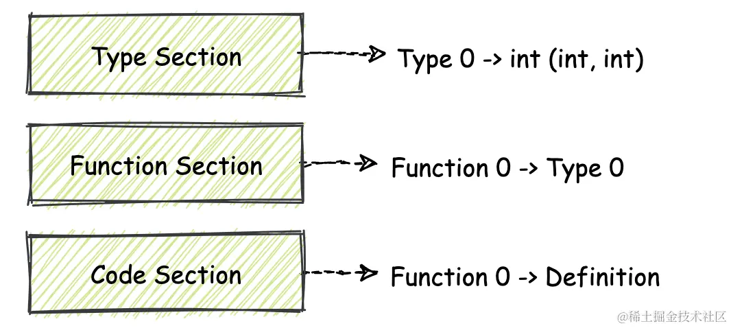 Wasm 中,所有模块内使用到的函数都会通过整形 indices(一个索引数组)来进行索引并调用。Function Section就是这个数组