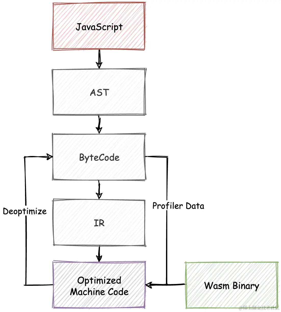 从下图所示的 V8 引擎编译管道中你可以看出。相较于 JavaScript 而言,浏览器引擎在执行 Wasm 字节码时不需要经过诸如“生成 AST”、“生成 Bytecode 字节码”、“生成 IR” 以及“收集运行时信息”等多个步骤。JavaScript 引擎的优化编译器后端可以直接将 Wasm 字节码转换为经过优化的机器码,进而以接近 Native 代码的效率来执行。