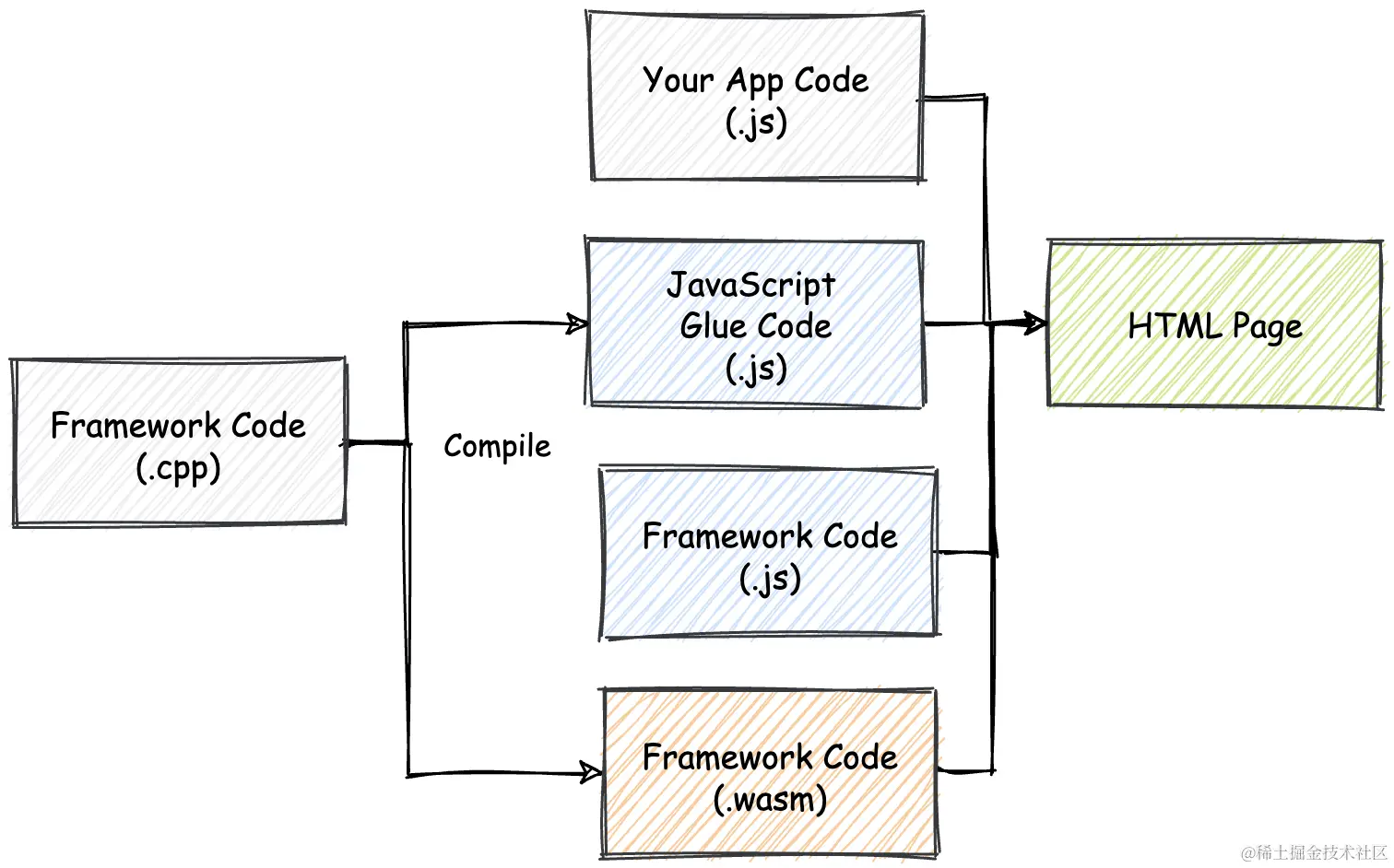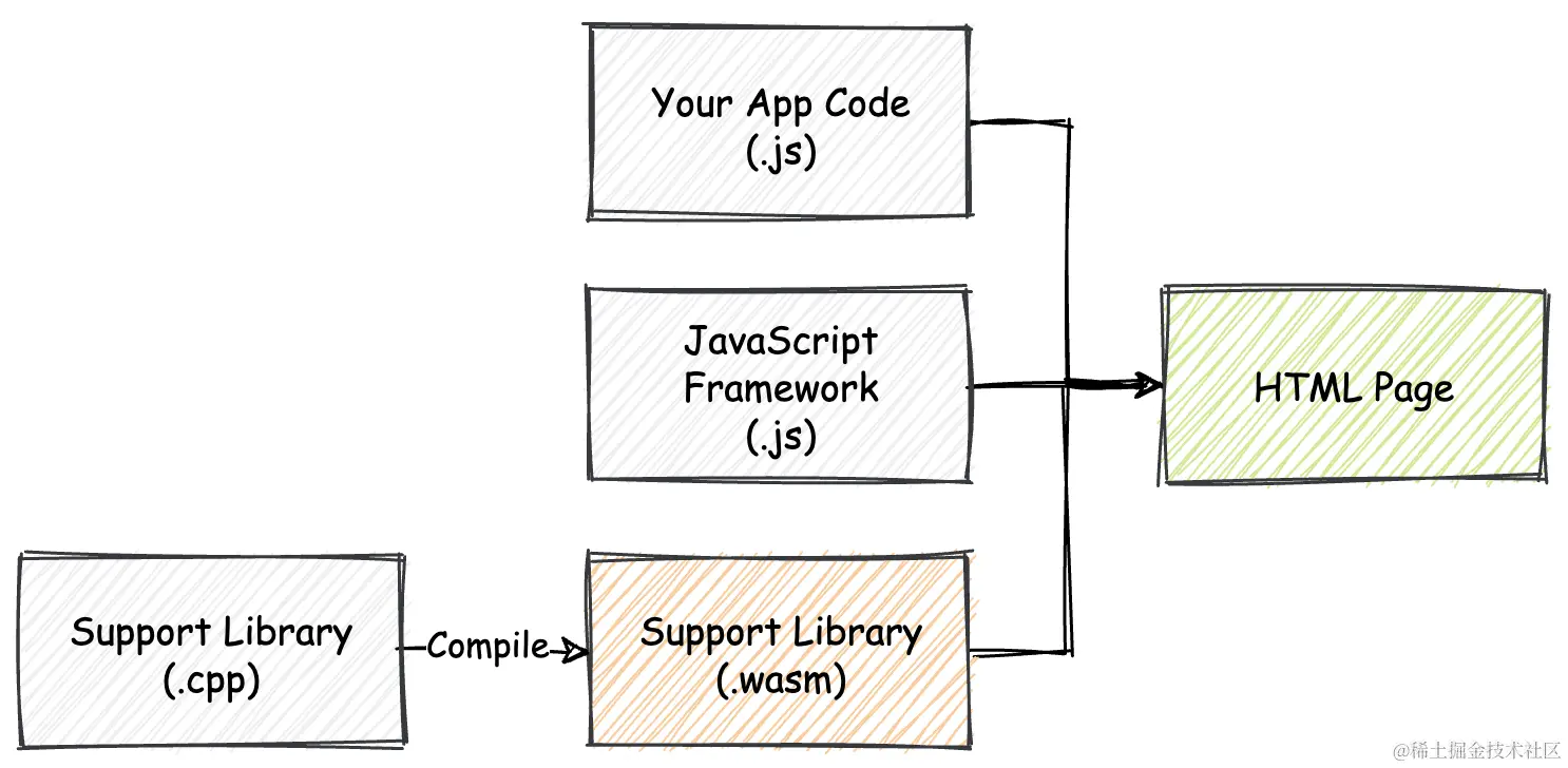一个 Wasm 模块,或者说是 Wasm Web 应用的完整开发流程涉及到多个部分。除了组成应用最基本的 HTML、CSS 以及 JavaScript 代码外,对于 Wasm 模块的开发和编译,我们还需使用到由 Rust 和 C++ 等系统级编程语言编写的模块源文件、相关的标准库,以及用于编译这些源代码的编译工具链,比如 Emscripten。